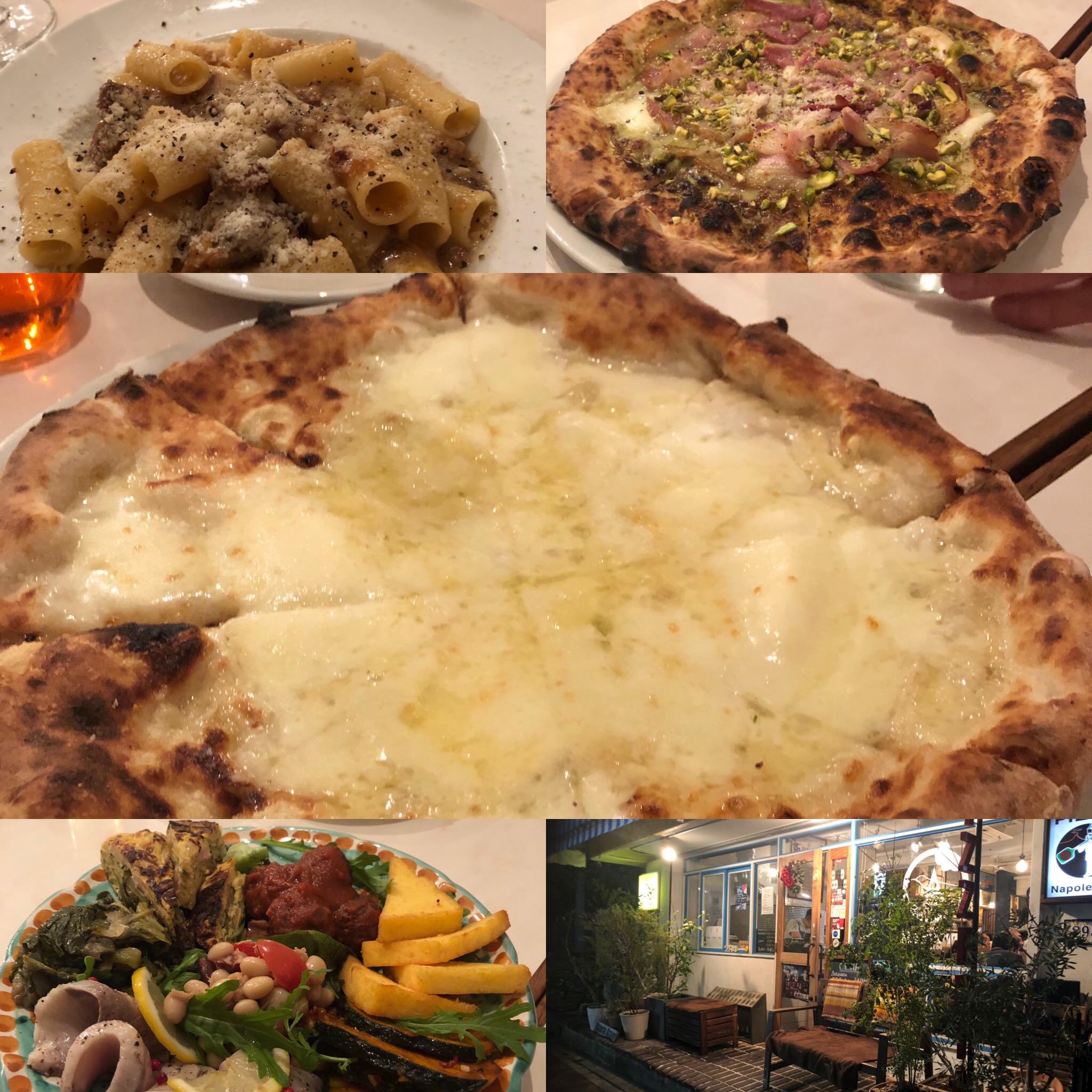 ピッツァ(ピスタチオ)・パスタ・ピッツァ(クワトロフォルマジオ)→チーズがたっぷりにはちみつをかけて食べます。これが最高!!!いくらでも食べれます。生地は柔らかくてモッチリ・・・生きててよかったぁ~!!!